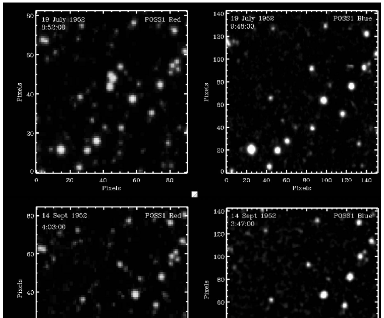 Caption from Dr. Villarroel’s paper: “Four exposures of the 3 ×3 arcmin region of sky centered on the triple transient identified in July 1952. Upper left: The POSS I red image on July 19, 1952 at 8:52 (UT) containing the triple transient just above center. Upper right: A 10 m exposure POSS I blue image of the same region taken immediately afterward with no evidence of the triple transient. Lower left and right: POSS I red (left) and blue (right) images taken two months later (September 14, 1952) showing the transient still gone.  Adapted from Solano et al. (2024).”