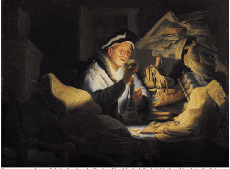Tax preparation by candlelight: Rembrandt, The Parable of the Rich Fool, 1627 (Gemäldegalerie, Berlin)