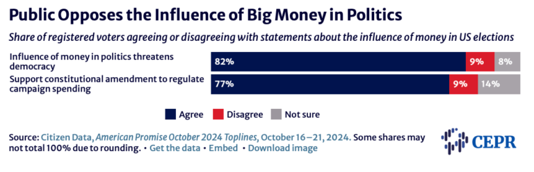 Money dominates American politics, where the ability to spend millions and even billions of dollars is often the deciding factor in who gets elected. This political spending also significantly influences who has access and can successfully lobby elected officials. The Supreme Court has explicitly barred Congress or any state government from addressing this corruption by classifying political spending as protected speech. The vast majority of Americans agree: Individuals and entities should not be allowed to spend unlimited sums of money to buy elections and political power, and we should pass a constitutional amendment to allow the government to regulate money in politics.