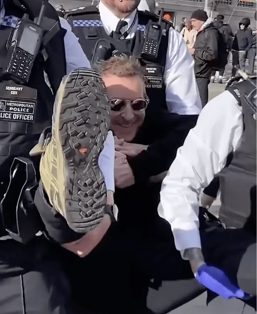 Robert Del Naja’s arrest during Palestine Action protest at Trafalger Square. Screengrab from video posted to YouTube.