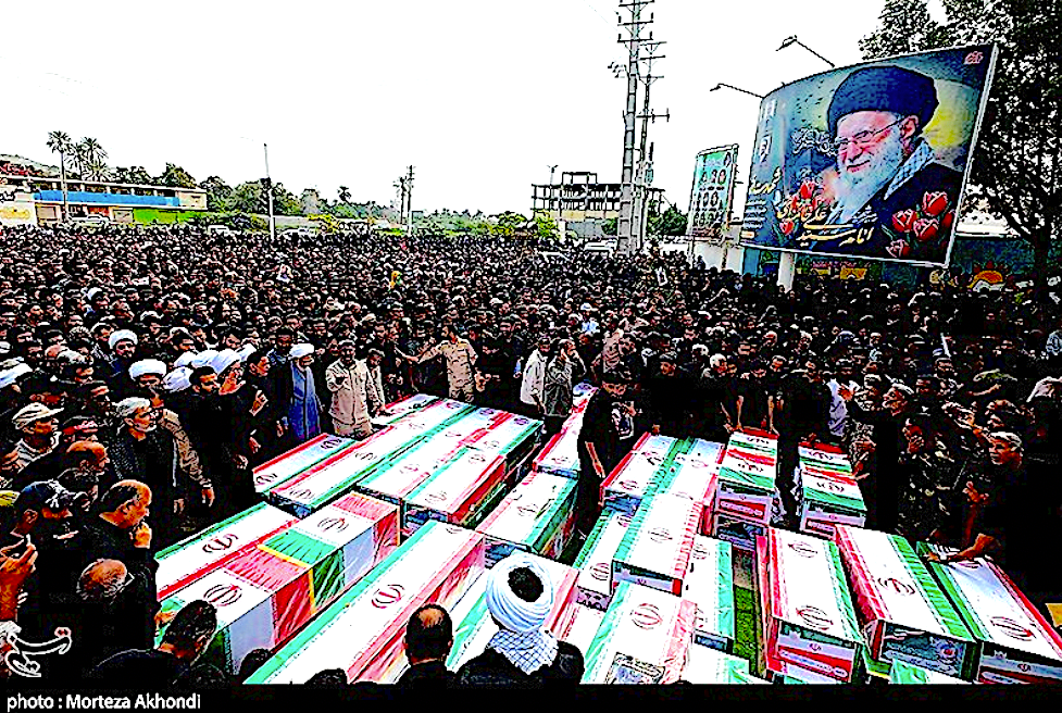 The funeral on March 3, for the victims of the U.S.-Israeli attack on the Shajareh Tayyebeh girls’ elementary school in Minab, Iran. (Tasnim News Agency/ Wikimedia Commons/ CC BY 4.0)