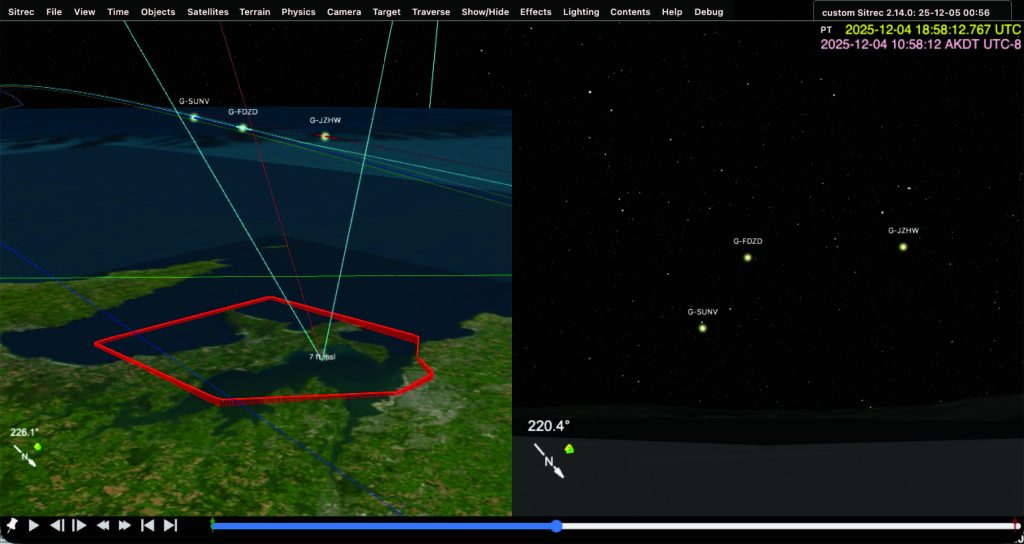 The first thing we noticed was several planes in a holding pattern just off the coast. Recreating this situation in Sitrec, we saw that, again, these distant circling planes could easily be mistaken for hovering drones in the dark.