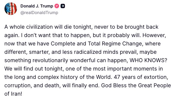 The post was offensive and shocking not just for its language and its unveiled threat of war crimes on civilian infrastructure, but for its invocation of Allah in the bombing of the Islamic Republic. Trump closed his threat to the people of Iran with the words, “Praise be to Allah.”