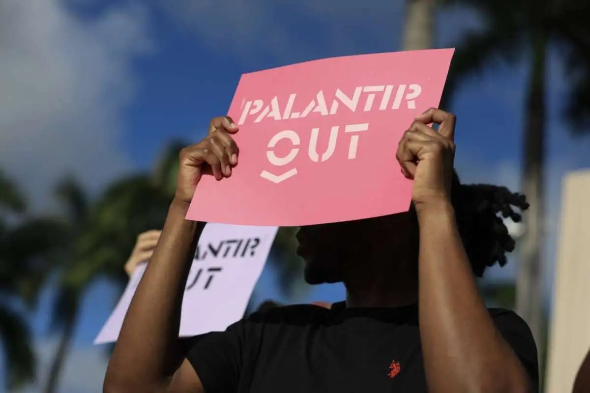 Protesters make themselves heard near Palantir’s new headquarters on March 03, 2026 in Aventura, Florida. Before relocating to Aventura in February 2026, Palantir had its headquarters in Denver, Colorado.