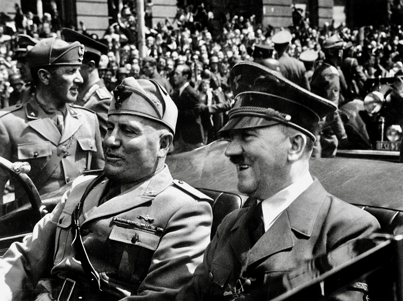 Adolf Hitler and Benito Mussolini in Munich, Germany in June, 1940. (National Archives and Records Administration, cataloged under the National Archives Identifier (NAID) 540151 / Part of Eva Braun’s Photo Albums, ca. 1913 – ca. 1944, seized by the U.S. government / Wikimedia Commons / Public Domain).