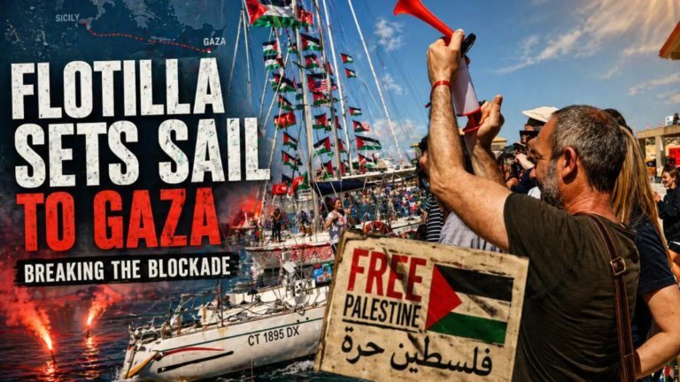 The number of participating vessels rose to 65 boats at the Augusta marina before completing final departure procedures. The flotilla then began sailing gradually into the Mediterranean Sea in coordinated stages during the afternoon.