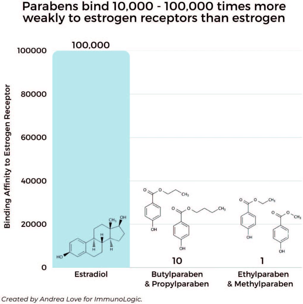 Butyl- and propylparaben bind 10,000 times more weakly than estradiol, the biologically active version of estrogen. Methyl- and ethylparaben bind 100,000 times more weakly (Golden et al. 2005). The weakness of these interactions mean there is no biological plausibility that parabens are outcompeting your hormones—even more so because your body absorbs only tiny percentages of the parabens you’re exposed to and then rapidly excretes them.