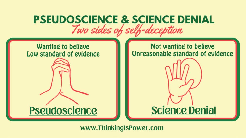 - Science denial: The rejection of strongly supported scientific conclusions. It’s driven by not wanting to believe, so our standard of evidence is impossibly high.